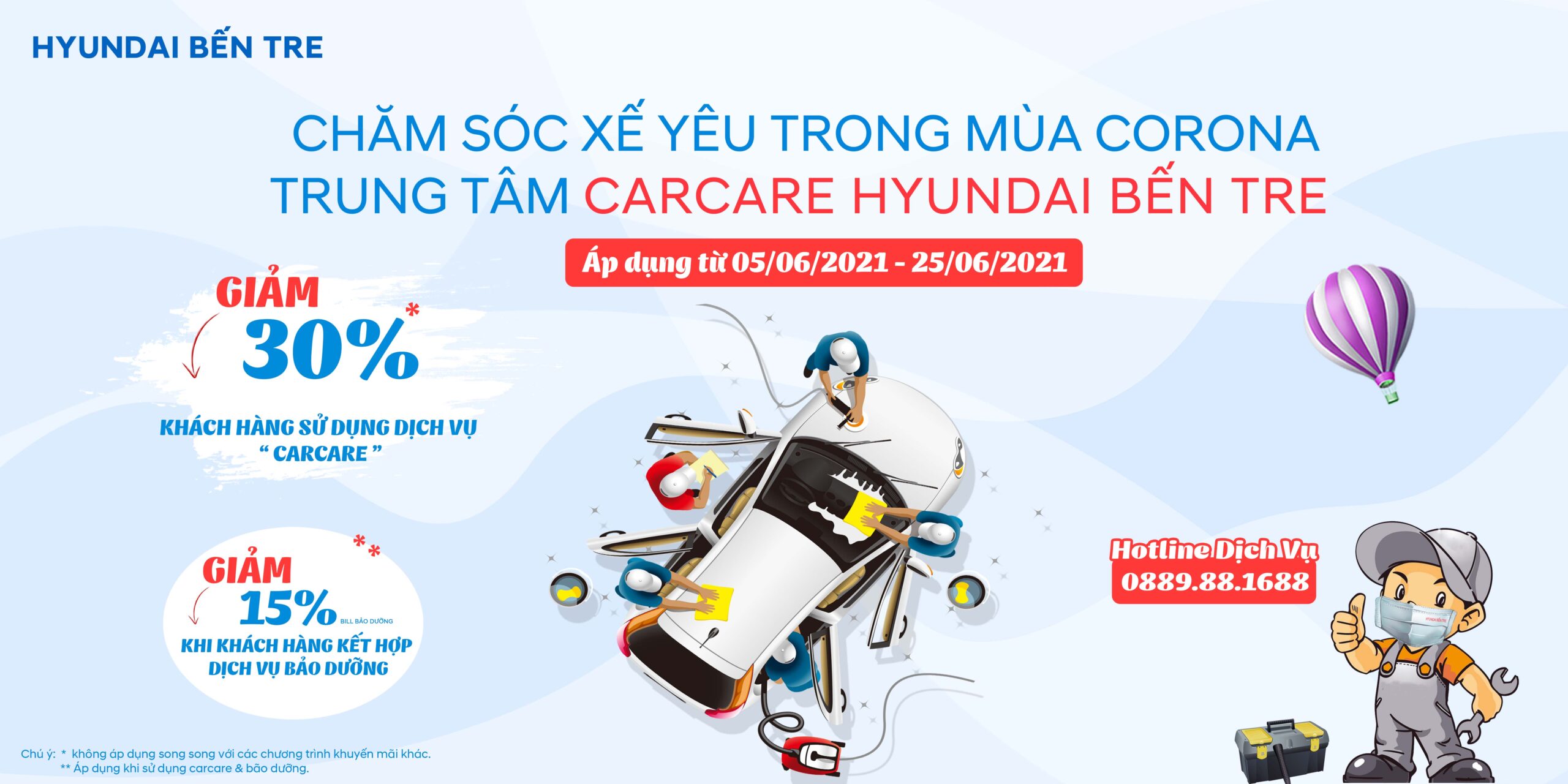 KHUYẾN MÃI DỊCH VỤ – CHĂM SÓC XẾ YÊU TRONG MÙA CORONA Nhằm đồng hành cùng khách hàng trong mùa CORONA, Trung tâm carcare Hyundai Bến Tre giành nhiều ưu đãi đặc biệt và hấp dẫn. Chi tiết chương trình như sau: Đối tượng áp dụng: Khách hàng sử dụng dịch...